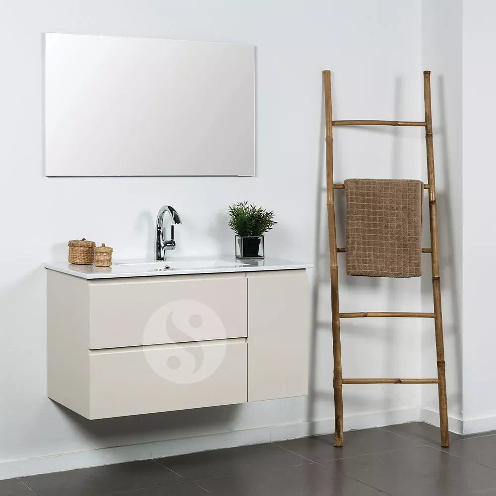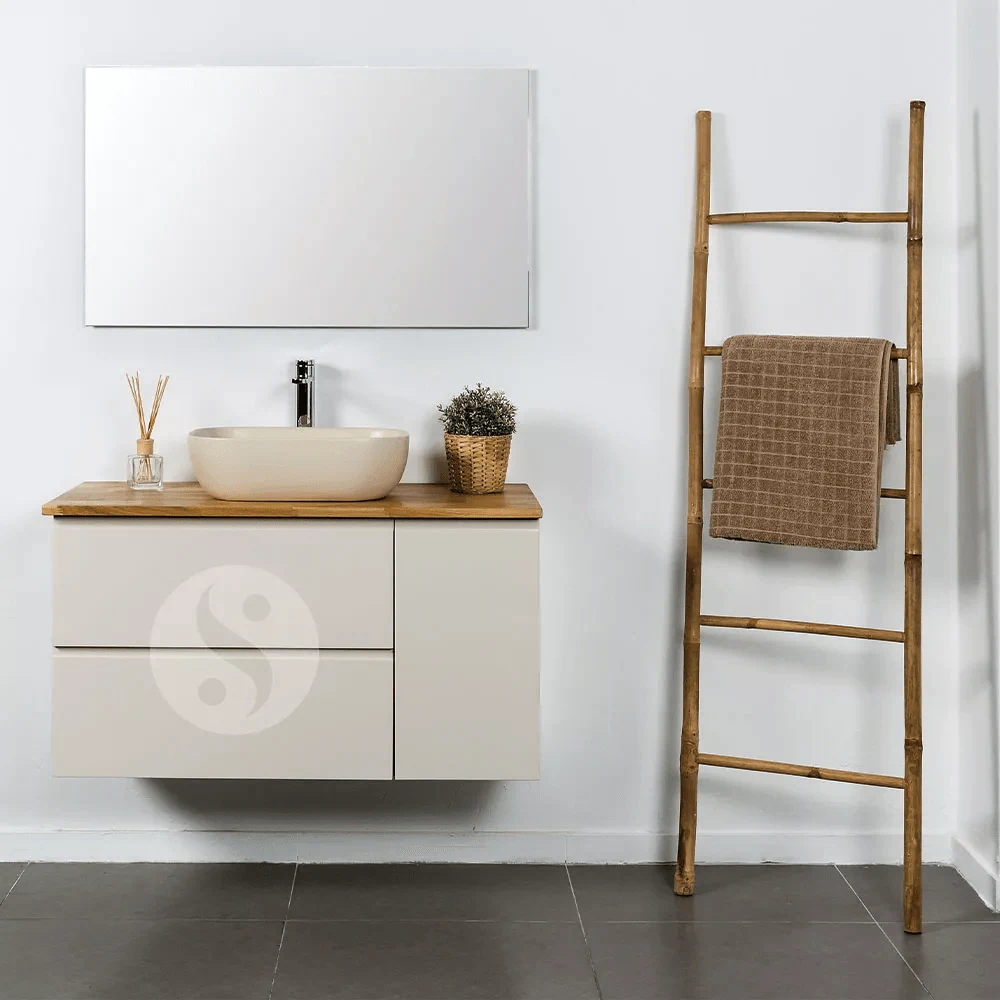 כולל 2 מגירות ודלת, משטח עץ, כיור מונח מעוצב, ומראה מרחפת