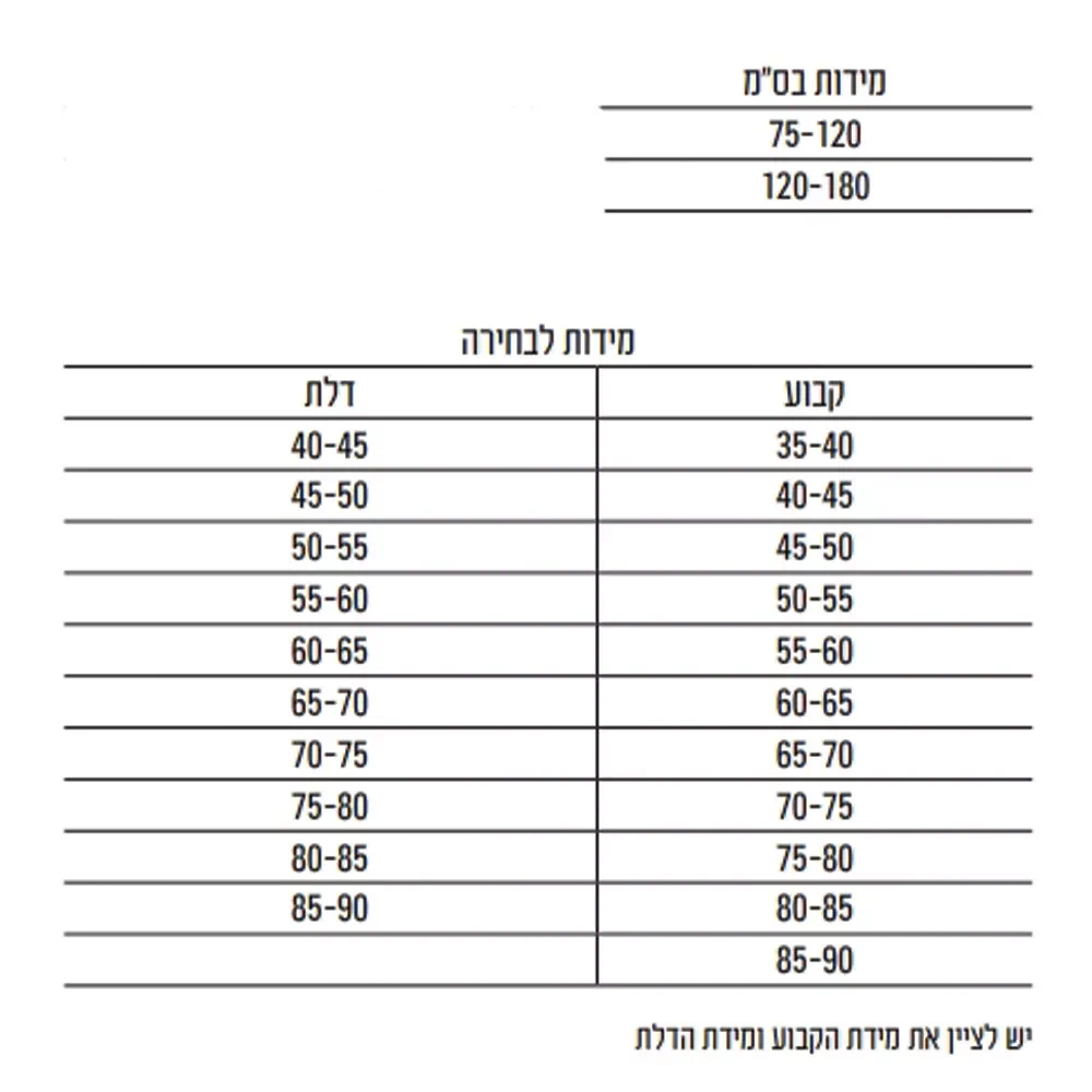 מידות: קיים במידות שונות לפי התמונה המצורפת