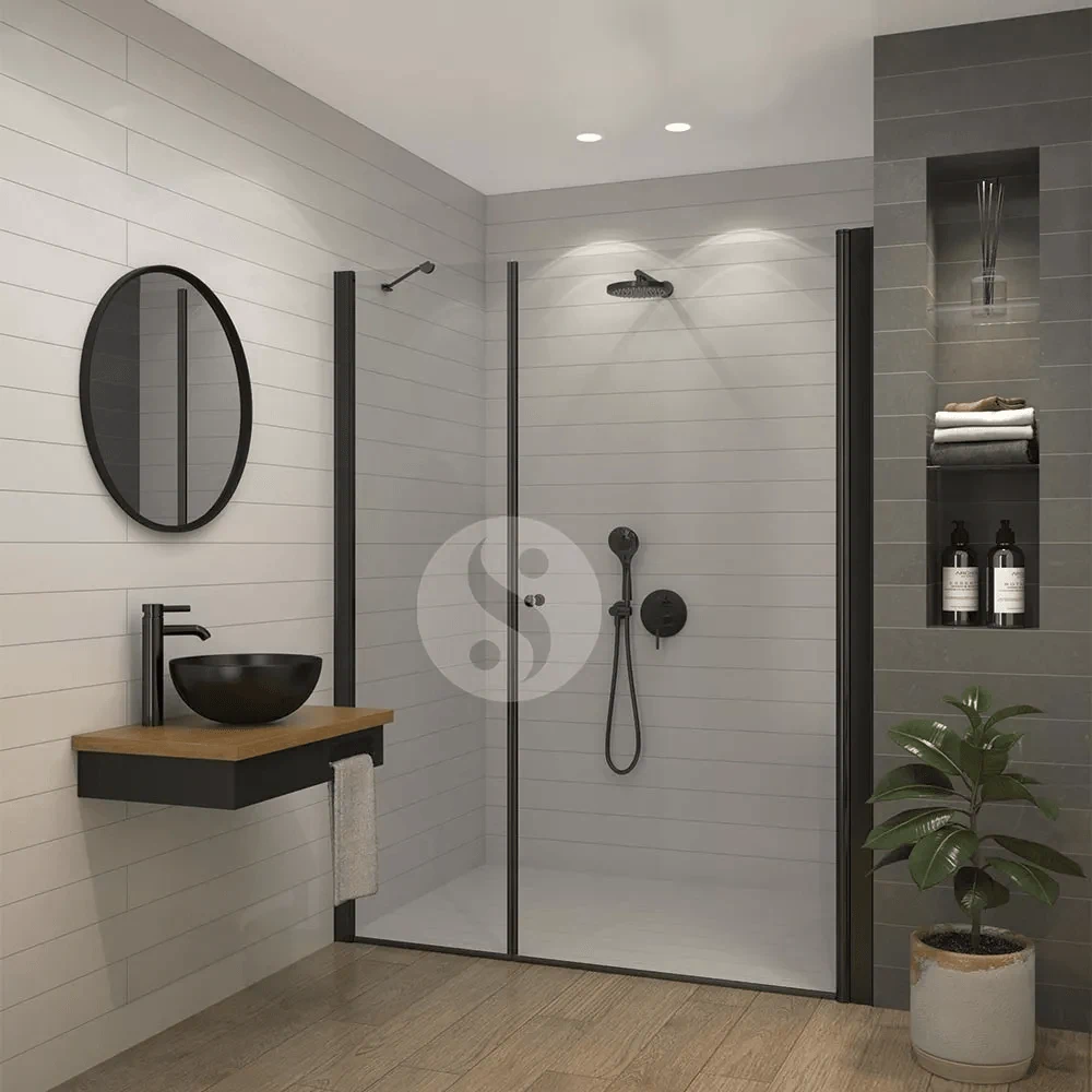 פרזול: ציר DOWN-UP, מגבי רצפה עשויים סיליקון,            סגירה מגנטית, ידית כפתור ומוט חיזוק בגימור            שחור מט